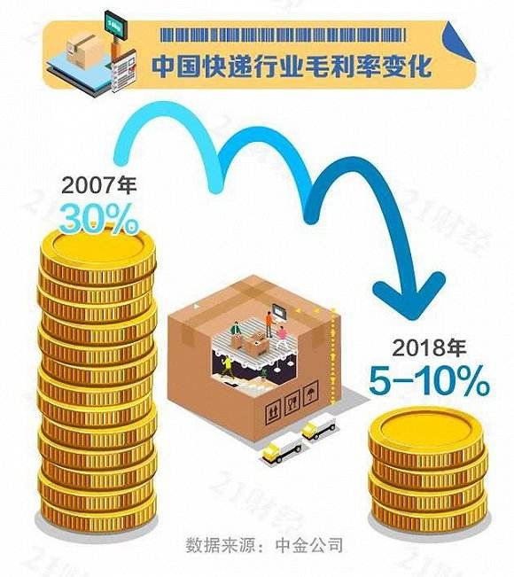 快递费越来越便宜、毛利率下降,从侧面反映快递企业市场竞争白热化,庞大的行业市场规模带来的边际效益正在减少。市场正从量变走向质变,随着消费者需求不断细化,快递行业未来亟需新的增长点。