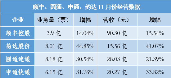 12月18日晚间,顺丰控股(002352)、申通快递(002468)、韵达股份(002120)和圆通速递(600233)发布未经审计的11月份经营简报,四家快递企业均保持稳健的发展态势。其中,圆通在11月份业务量完成了对韵达的反超。