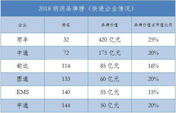 12月21日,2018胡润品牌榜发布,顺丰、中通、韵达、圆通、EMS和申通六家快递企业悉数入围。其中,中通位列总部在上海的最具价值民营品牌第三名。