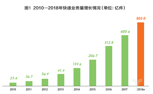 业务量规模再创新高。预计2018年快递业务量突破500亿件,达到503亿件,同比增长25.6%。业务量规模连续5年稳居全球首位,是第二名美国的3倍多,占全球快递包裹市场份额超过一半,成为全球快递市场发展的动力源和稳定器。全年净增量超过100亿件,超过2013年全年快递业务量。快递业务规模继续保持高位运行,日均快件处理量1. 4亿件,同比每天新增3000万件。最高日处理量4.2亿件,同比增长25.7%,规模再创历史新高。人们使用快递频率明显增加,年人均快件使用量36件,同比增加7件,快递成为继衣食住用行后又一基本需求,“食住用行递”成为日常生产生活的重要组成部分。