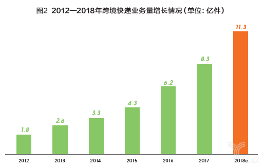 对外开放度稳步优化。受跨境寄递能力提升与跨境电商发展的影响,跨境快递业务继续保持高速增长态势。预计2 018 年跨境快递业务量将超过10亿件,达11. 3亿件,同比增长36.6%,比行业整体增速高10个百分点以上。11月跨境快递业务量突破1亿件大关,快递助力实现“买全球、卖全球”的同时带动自身业务增长。