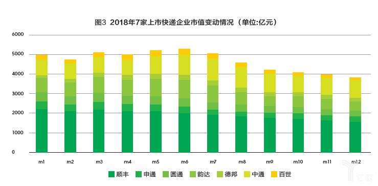 快递板块上扬下抑。受资本市场整体萧条的影响,快递板块表现上半年明显优于下半年,上半年7家企业市值之和维持在5000亿元以上,下半年市值在4000亿元左右。市值之和的峰值出现在6月,达到5340亿元;谷值出现在12月,仅为3870亿元。在7家上市企业中,缩水较为严重的是韵达和百世,较其最高市值分别缩水47%和57%,其余企业也分别较最高市值缩水2~4成。