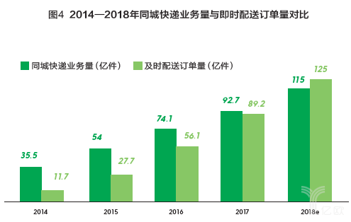 特别是饿了么在合并口碑后又合并了百度外卖,本地生活领域“洗牌”后进入寡头竞争阶段,但其他领域仍处于完全竞争状态。受资本驱动和消费本地化影响,即时配送市场增长迅猛,2018年预计即时配送订单量为125亿件,而同期同城快递业务量规模约为115亿件,2018年即时配送订单量将首次超过同城快递业务量。