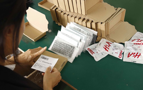 在菜鸟跨境物流合作伙伴递四方速递的深圳机场仓库,一位分拣员正在打包,商家发货的手机膜按目的地国,被装入了不同颜色的集包袋。原本一个集包袋约能装下120个泡沫盒,现在可以装240多个新型包装,节省了一半运输空间,物流效率大大提高。
