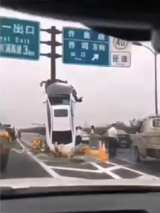 杭州东湖高架往乔司外翁线方向,一辆白色小车车头整个竖了起来!