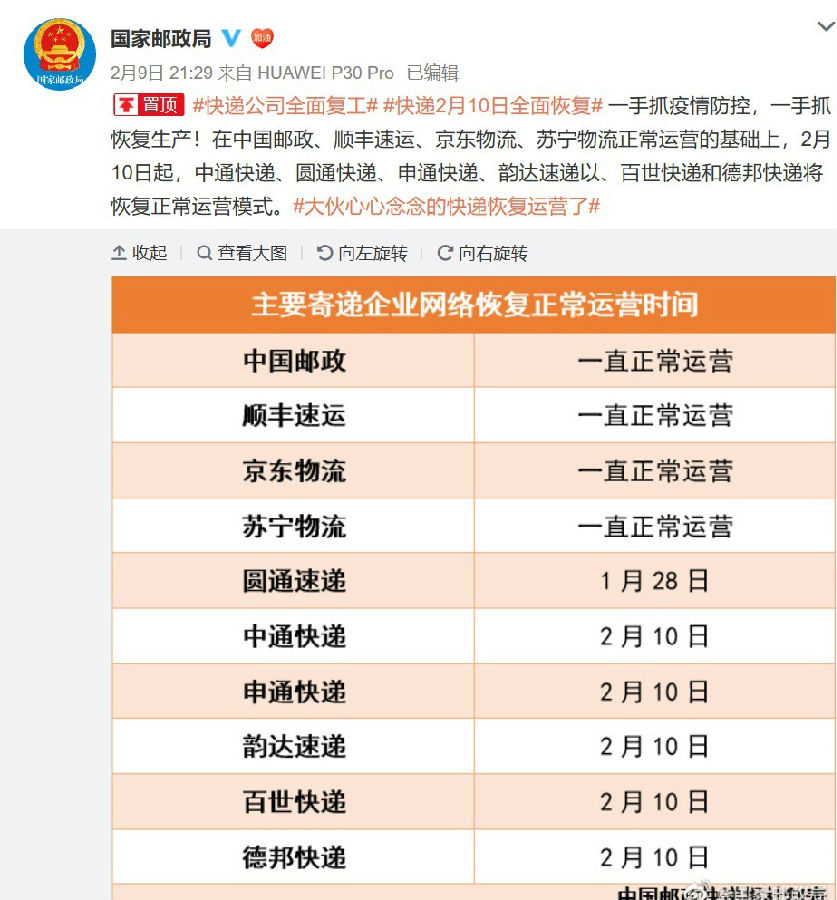 2月10日消息,昨日晚间,国家邮政局通过微博发布了寄递企业恢复正常运营的时间表,并表示,在中国邮政、顺丰速运、京东物流、苏宁物流正常运营的基础上,2月10日起,中通快递、圆通快递、申通快递、韵达速递以及百世快递将陆续恢复到正常运营模式。