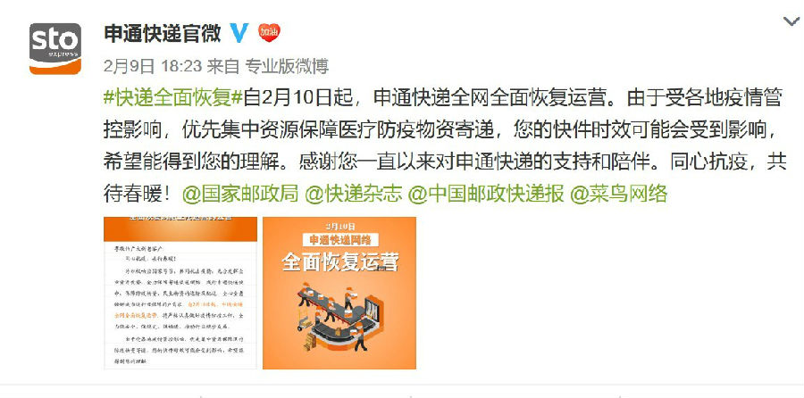 据《电商报》了解,申通快递2月9日也正式宣布,自2月10日起,全网全面恢复运营,将严格认真做好疫情防控工作,全力保安全、保稳定、保畅通,推动行业稳步发展。