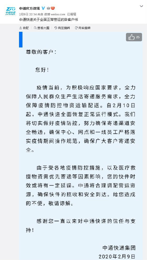 与此同时,申通还表示,由于受各地疫情管控影响,优先集中资源保障医疗防疫物资寄递,用户的快件时效可能会受到影响,希望能得到理解。同日,韵达、中通也发布全面正常运营告客户书,且同样表示将优先集中资源保障医疗防疫物资寄递。圆通则于此前1月28日宣布全网全面恢复正常运营。