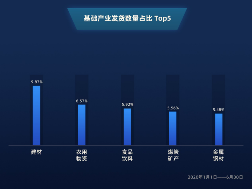 2020年1月1日至6月30日,满帮货运平台数据显示,在基础产业的货物类型中,以建材、煤炭矿产、金属钢材为代表的第二产业,排在上半年发货数量的前列。以农用物资、木材苗圃、蔬菜为代表的第一产业货品紧随其后。