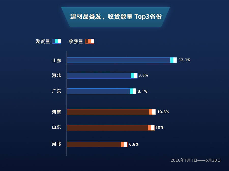 其中,建材订单量占据基础产业第一位,与去年同期相比,上升25.9%。根据国泰君安证券研究所已发布的研究报告分析,疫情对建材行业整体影响有限,原因是疫情对经济形成冲击后,基建将成为稳经济的重要举措。以山东省发货数量排名第一、收货数量排名第二,河北省发货数量第二、收货数量排名第三的数据来看,显示了山东及河北两省强健的生产能力,以及基础建设需求旺盛的特点。