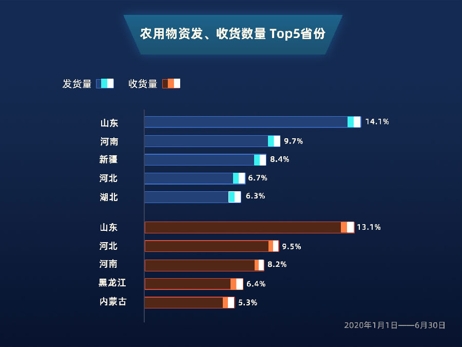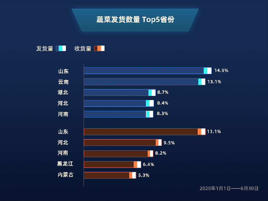 值得一提的是,年初疫情最为严峻的湖北省,在恢复生产后,依然跻身农用物资发货数量top5,同时在货运平台上蔬菜的发货数量中,以8.7%的占比位居第三。充分说明,遭遇疫情冲击的湖北,已迅速恢复,在保障本省农业产品需求的同时,也具备向外省输送到能力。