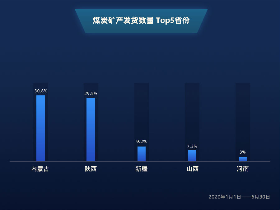 作为保障能源供应的重点货物,煤炭矿产也是公路货运中非常重要的品类。上半年,受疫情影响,部分地方政府对人员、车辆流动进行了不同程度的调控,导致煤炭公路运输受到影响。满帮货运平台数据显示,1至6月,煤炭矿产类发货量与去年同期相比下降7.6%。从煤炭矿产的发货数量来看,产业依然在资源富集地区集中,山西、内蒙古、陕西和新疆,这四个省份原煤产量占全国76.8%,发货数量也稳居前四,持续将优质产能向全国释放。