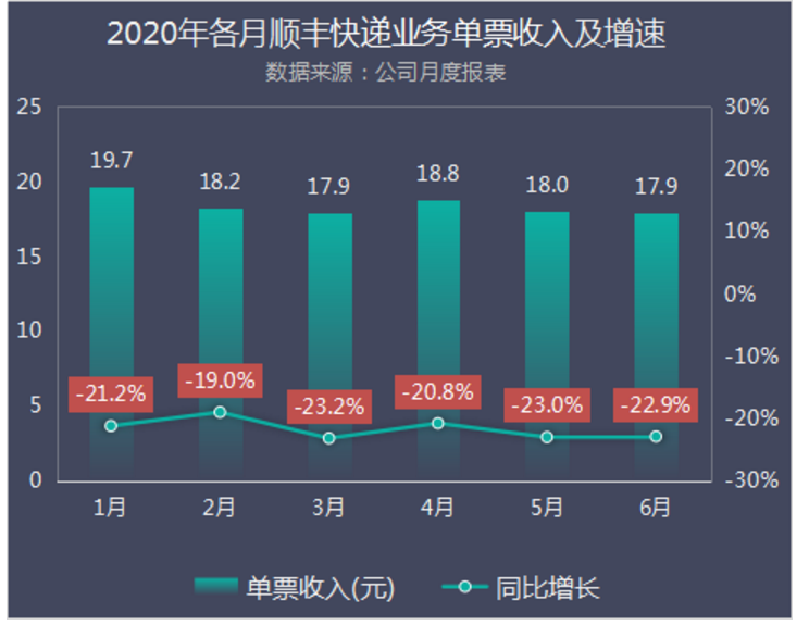 数据曲线显示:从2019年6月开始,顺丰的单票收入呈现持续同比下降趋势。2019年全年,顺丰快递业务单票收入21.93元,较2018年的23.26元,下降了1.33元;2020年前6个月,顺丰的平均单票收入为18.39元,同比下降22.18%,较上年同期的23.63元,每单便宜了5.24元。