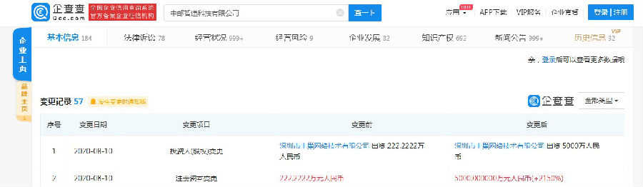 8月11日消息,《电商报》获悉,企查查数据显示,8月10日,中邮智递科技有限公司(以下简称“中邮速递易”)发生工商变更,注册资本由222.2222万元增加至5000万元,增幅为2150%,由深圳市丰巢网络技术有限公司全额出资。