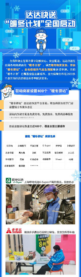 据介绍,“暖冬驿站”是达达快送联合沃尔玛、永辉超市、华润万家、绿地优选G-Super、北京华联等数十家商家在线下门店设立的骑士专属休息区,提供免费充电、免费热水、免费药品等服务。目前,达达快送已在全国设有近400个“暖冬驿站”。