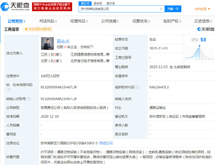 12月7日消息,《电商报》获悉,天眼查数据显示,12月3日,苏州苏菜物流有限公司成立,注册资本100万元人民币,法定代表人为高志杰,经营范围含道路货物运输;道路货物运输;生鲜乳道路运输;运输设备租赁服务等。
