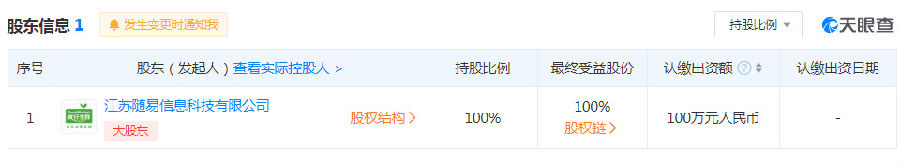 天眼查股东信息显示,该公司由社区生鲜采购平台“食行生鲜”关联企业——江苏随易信息科技有限公司全资持股。