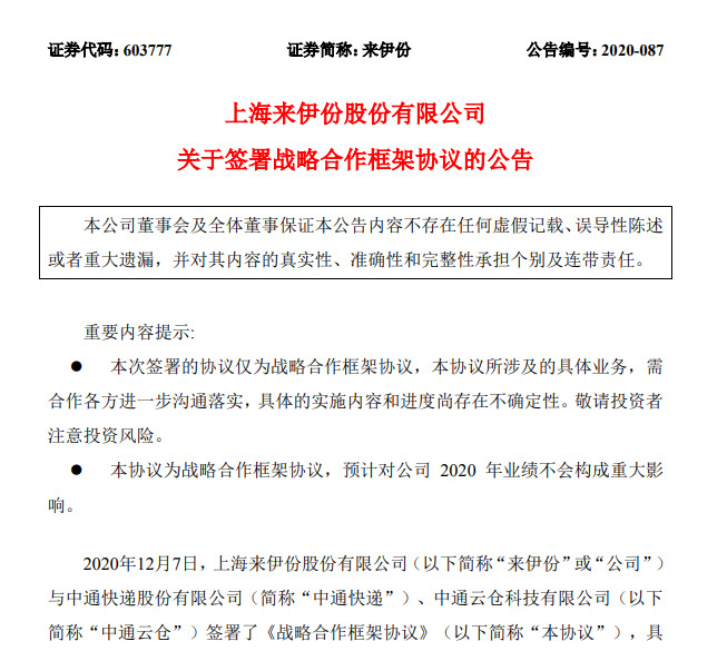 12月7日消息,来伊份发布公告表示,公司与中通快递、中通云仓签署了战略合作框架协议,根据协议,拟开展包含但不限于云仓网络、共建万家小店新零售、OTO业务融合和新传媒营销的合作。