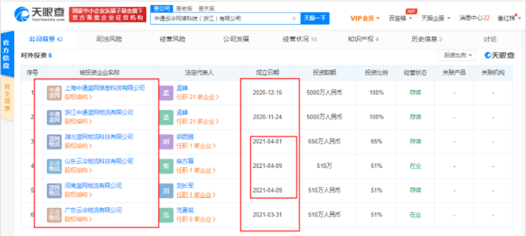 值得注意的是,目前,中通冷链落子覆盖浙江、上海、广东、湖北、河南、山东6个地区。除了成立上述2家蓝网相关公司之外,进入2021年以来,中通冷链还成立了4家公司,包括广东云冷物流有限公司、湖北蓝网物流科技有限公司、河南蓝网物流有限公司、山东云冷物流科技有限公司。仅是4月份,中通冷链就成立了2家蓝网物流公司,并扩张3省。