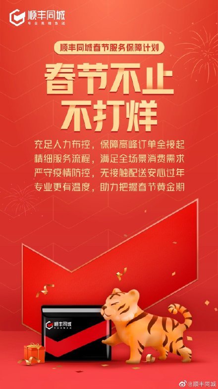 值得一提的是,此前,顺丰同城在其官方微博上宣布开启春节服务保障计划,提出“春节不止不打烊”,全力保障春节期间的全场景订单配送需求,致力于高峰期订单全接起。