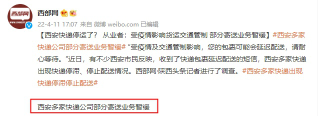 4月12日消息,据西部网报道,因疫情影响,西安目前有多家快递公司的寄送业务暂缓。