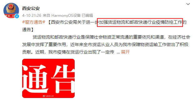 值得一提的是,近日,西安公安发布了《西安市公安局关于进一步加强货运物流和邮政快递行业疫情防控工作的通告》。