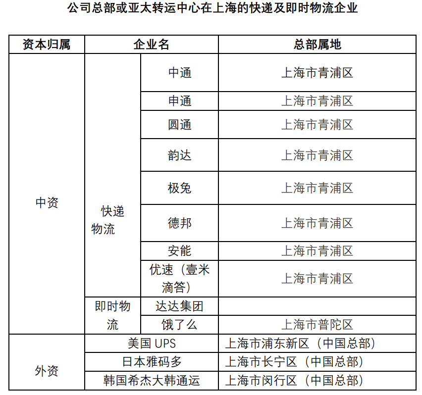 2021年,中通快递突破日单量6000万单,这个全球业务规模最大的快递商就来自上海。而目前在中国9家上市快递公司中有6家位居上海青浦区:中通、申通、圆通、韵达、德邦(大件快递)安能(大件快递)。极兔快递成功收购百世快递,市场份额或仅次于韵达、圆通。6家公司承担着中国大部分的电商物流业务。