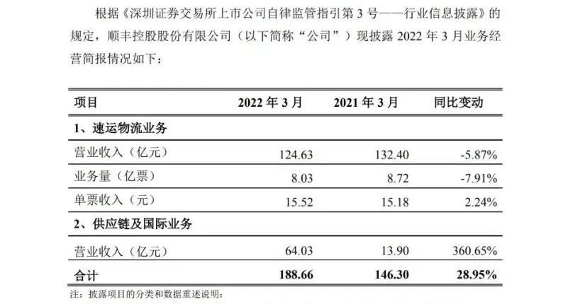 公司2022年3月速运物流业务、供应链及国际业务合计收入188.66亿元,同比增长28.95%,其中供应链及国际业务收入同比增长360.65%,增长较快的原因主要为合并嘉里物流的相关业务收入所致。
