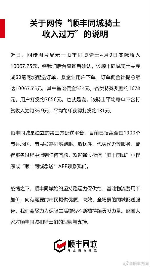 4月11日,顺丰同城在微博平台就此事做出说明,消息属实,经系统确认,该名骑士当日实际收入确实为10067.75元。