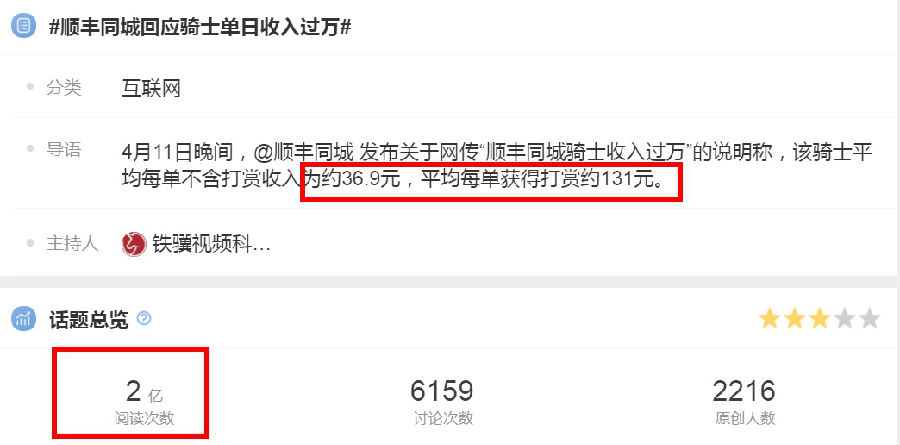 经过顺丰同城的证实,一时间该事件直接冲上微博热搜,数据显示,目前该话题已经收获了2亿阅读次数。