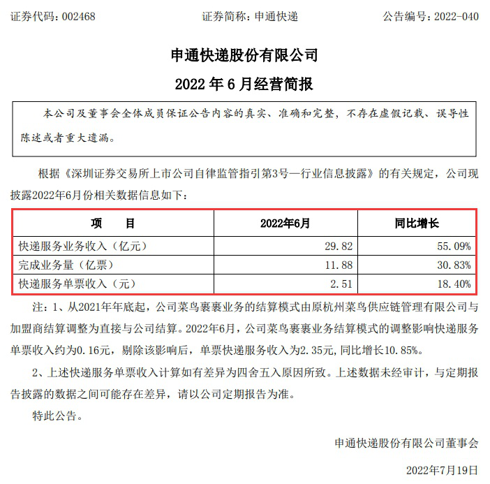 7月18日消息,今日,申通快递股份有限公司(简称“申通快递”)发布公告称,该公司2022年6月快递服务业务收入29.82亿元,同比增长55.09%。