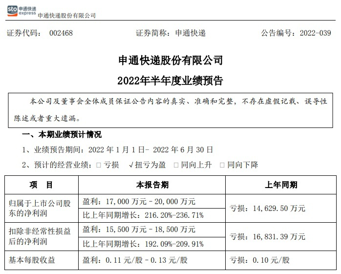 另外,申通快递近日还发布了2022年半年度业绩预告,业绩预告期间为2022年1月1日-2022年6月30日。