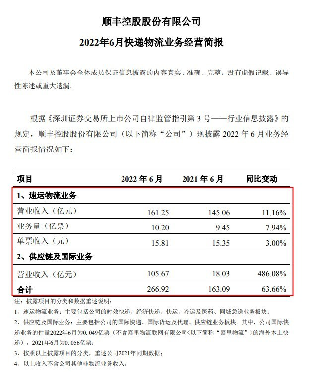 值得一提的是,今日,顺丰控股股份有限公司也发布了2022年6月业务经营公告。公告显示,2022年6月顺丰公司速运物流业务、供应链及国际业务合计收入266.92亿元,同比增长63.66%。