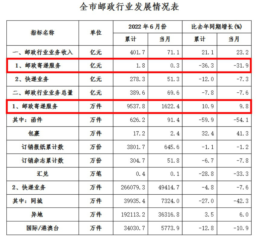 值得注意的是,1-6月份,深圳市邮政服务业务总量累计完成8.2亿元,同比下降12.9%;邮政寄递服务业务量累计完成9537.8万件,同比增长10.9%;邮政寄递服务业务收入累计完成1.8亿元,同比下降36.3%。