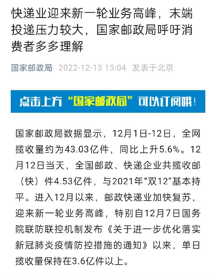值得关注的是,双12购物节已于近日结束,国家邮政局数据显示,12月1日-12日,全网揽收量约为43.03亿件,同比上升5.6%。12月12日当天,全国邮政、快递企业共揽收邮(快)件4.53亿件,与2021年“双12”基本持平。