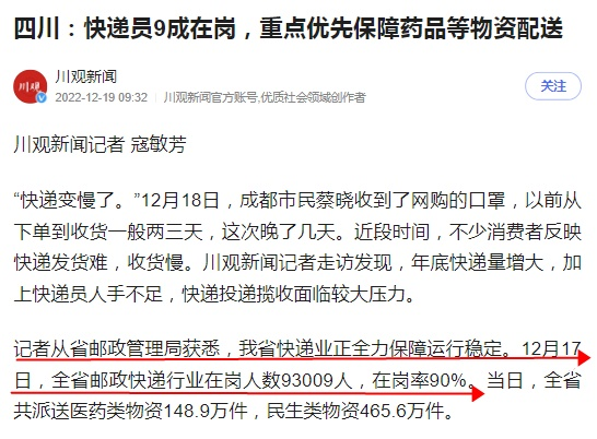 12月19日消息,川观新闻记者近日从四川省邮政管理局获悉,四川省快递业正全力保障运行稳定。12月17日,全省邮政快递行业在岗人数93009人,在岗率90%。当日,全省共派送医药类物资148.9万件,民生类物资465.6万件。