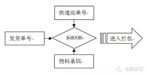 发货单号、快递运单号、物料编码三者在系统中做关联。操作是:扫描发货单号、快递单号、物料条码,将所有物料和相应单据放在可辨识的物理单元(放在一堆或放在一个箱盒中)以示打包单位(打成一个包裹)。一个发货单可以对应多个快递单;一个快递单可以对应多个物料。发货单状态变更为拣货完毕。此环节的名称可以称之为校验装箱。有了这个步骤就可以知道:每一张发货单对应几个包裹,每一个包裹内有哪些物料。